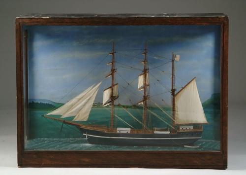 OUTSTANDING LARGE SHIP MODEL IN DIORAMA. This nicely detailed, three-mast sailing vessel mounted on simulated waves w/early New England painted village scene in background. The scene supposedly depicts Essex, Connecticut. SIZE: 42in.w x 12in. d x 30-1/2in. h. CONDITION: Generally very good. Some minor imperfections on case but ship and interior generally very good. 9-26409