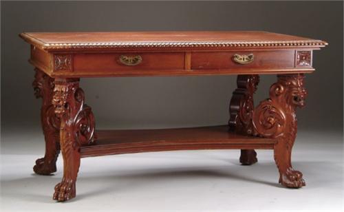 OUTSTANDING LION CARVED LIBRARY TABLE. Rectangular top table has heavily carved gadrooned edge. The frieze supports one drawer on each side with a faux drawer beside. The corners have square block carved decorations. The base has four large carved lions with open mouth and leaf scrolled backs. Ending in nicely carved claw feet. The lions support a large shaped shelf. All on castor feet. SIZE: 29in. h x 54in. w x 32-1/2in. d. CONDITION: Very good with one chip to inside of one leg. 9-26196