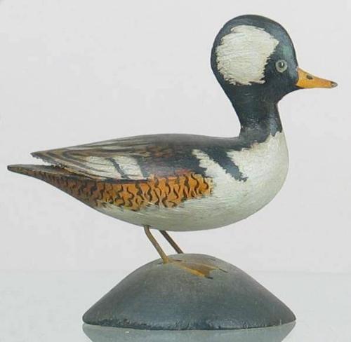 OUTSTANDING MINIATURE hooded merganser drake in XOC with dark blue paper label on the bottom with " A. E. Crowell and Son Bird Carving East Harwich, Mass" with "Hooded Meg" written across the center. (decoy)