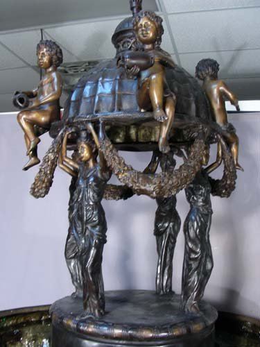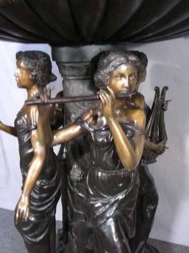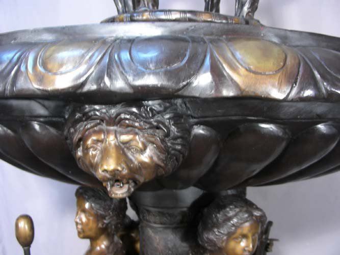 An ornate base with four ladies playing musical instruments. Center of fountain with large scalloped bronze basin with lion's head motif. Top center domed section with four women and four seated children holding urns. Two color patina. 103" high, 4' wide.