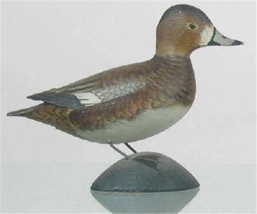 OUTSTANDING Miniature redhead hen by A. E. Crowell, East Harwich, MA in XOC with a blue paper label on the bottom of the base. "FE REDHEAD" written in ink on the label. (decoy)