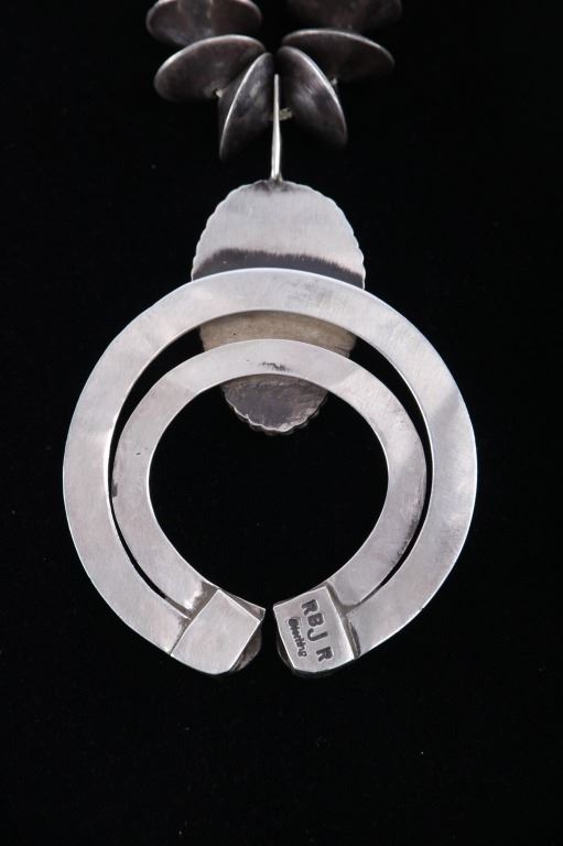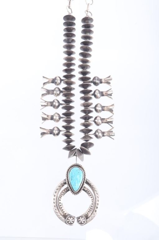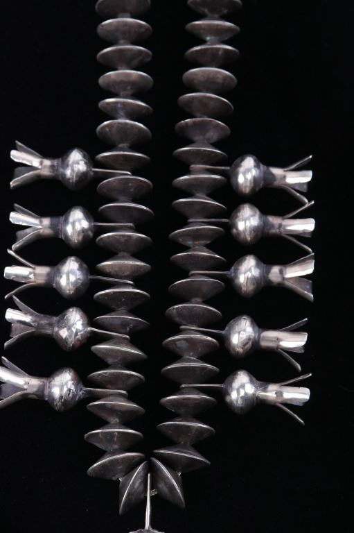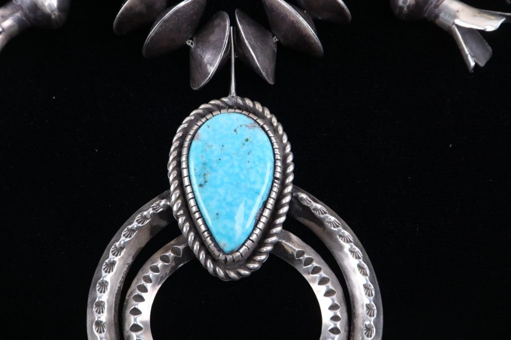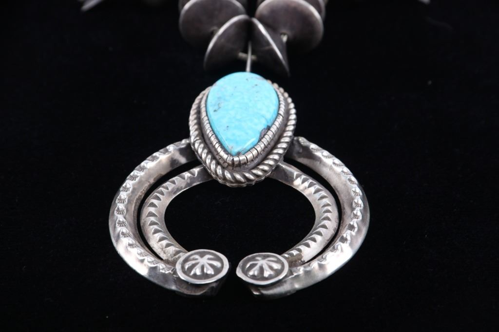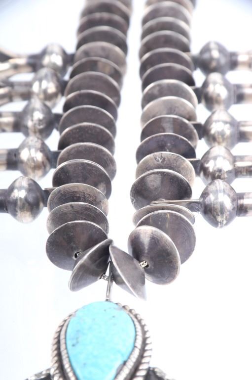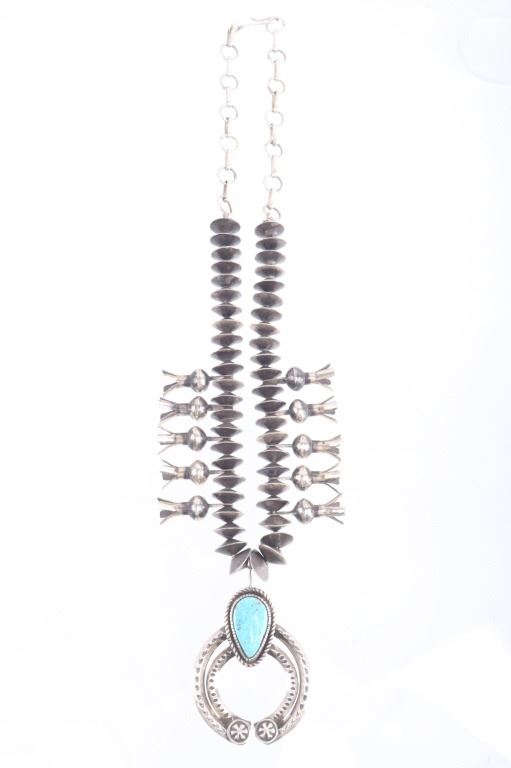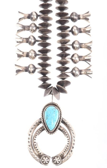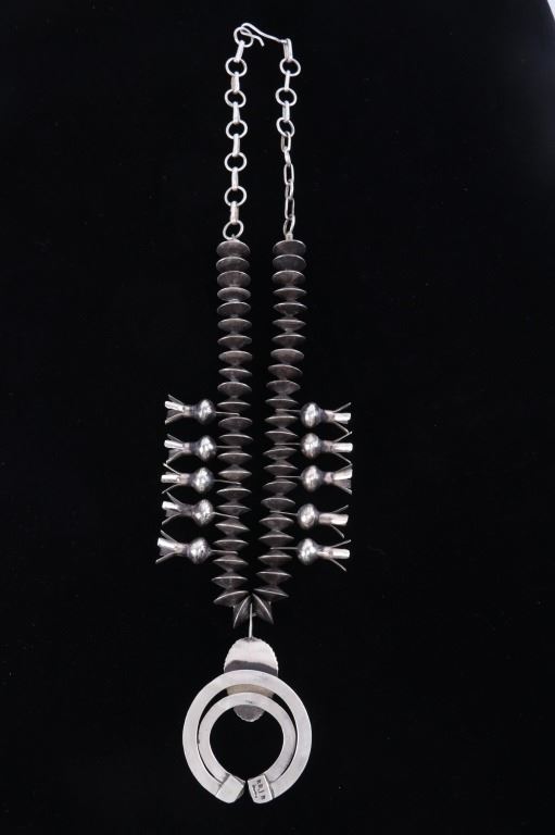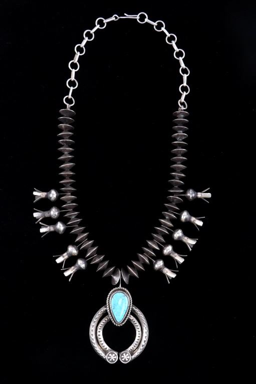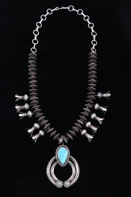 Featured in this lot is what is considered the finest completely hand-crafted example of squash blossom currently offered on the public market. The piece is from master silversmith Randy Begay Jr., son to renowned Randy Begay, and features a completely handmade large squash blossom necklace. Every element of this necklace is hand hammered and crafted from a blank piece of sterling silver by the artist, from the blossoms, beads, and pendant to the chain itself. The concho beads are large sterling silver examples hand pressed/hammered with a wonderful Old Pawn pattern of discoidal beads, totaling 46. The silver rope is hand braided and strung to a ring and link, handcrafted chain that ends in a handmade, adjustable, clasp and ring design. The necklace features ten total handcrafted blossoms adorning the necklace as spacers between the discoidal beads. The central pendant features a professionally and beautifully crafted Naga Squash with a double sterling silver bar construction, featuring hand hammered and tooled design set with a wonderful piece of natural turquoise from the Fox Mine (Fox Turquoise). The center stone is profusely decorated with a double, handcrafted, twisted rope border and a beautiful pear shape Fox turquoise cabochon. The Fox turquoise boasts a light and bright blue luster to the coloration and slight inclusions of mineral deposits that are small; the face of the stone is polished. The artist’s hallmark can be seen on the backside of the Naga pendant and features a 'sterling' stamp underneath the hallmark. The condition of this necklace is pristine and beautiful, with no obvious signs of damage. The measurements of this squash blossom from clasp to clasp are 26 1/2" and the Naga pendant measures 3 1/2" x 2 1/4" x 5/8". The collective weight of this necklace is 184.4 g. This is the best Squash Blossom necklace to come through this auction and is of the best quality available to the public market. Very few Randy Begay Jr. pieces of this size and magnitude are ever offered for sale, with this being one of his best pieces ever created. The necklace carried a gallery price of $20,000.
