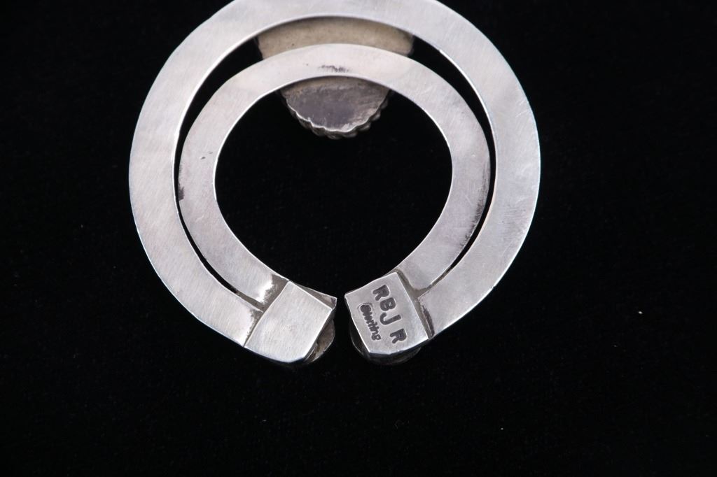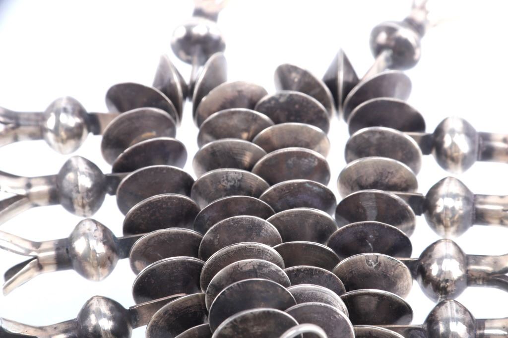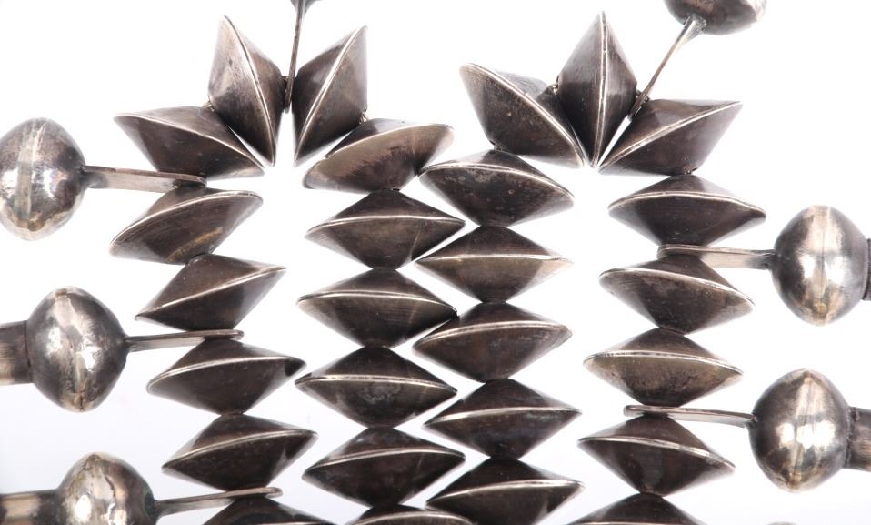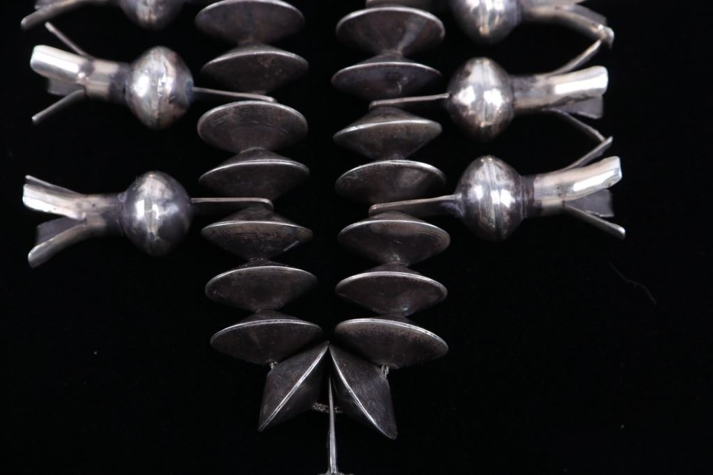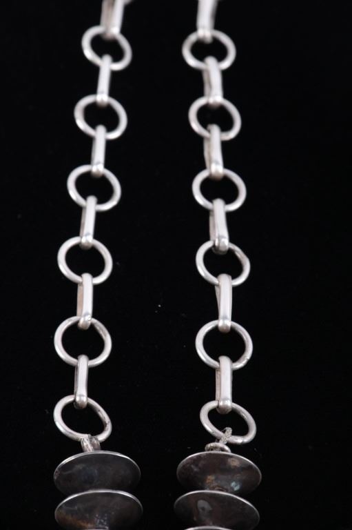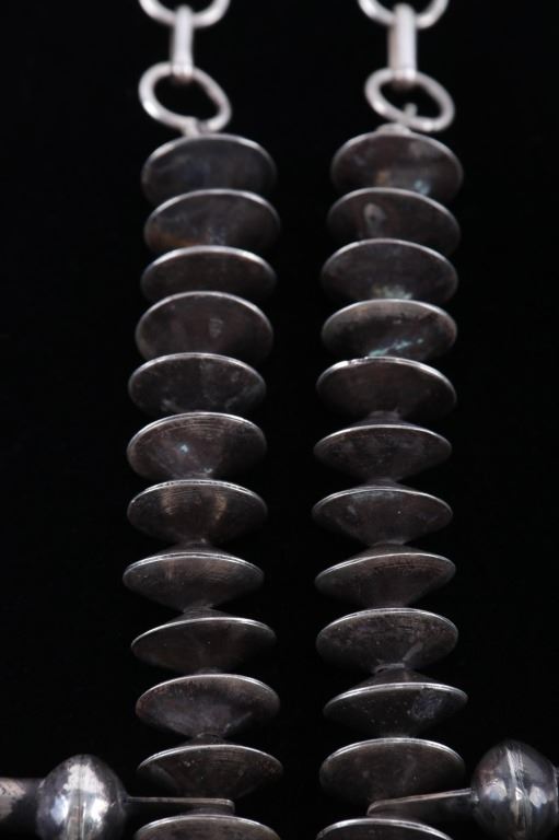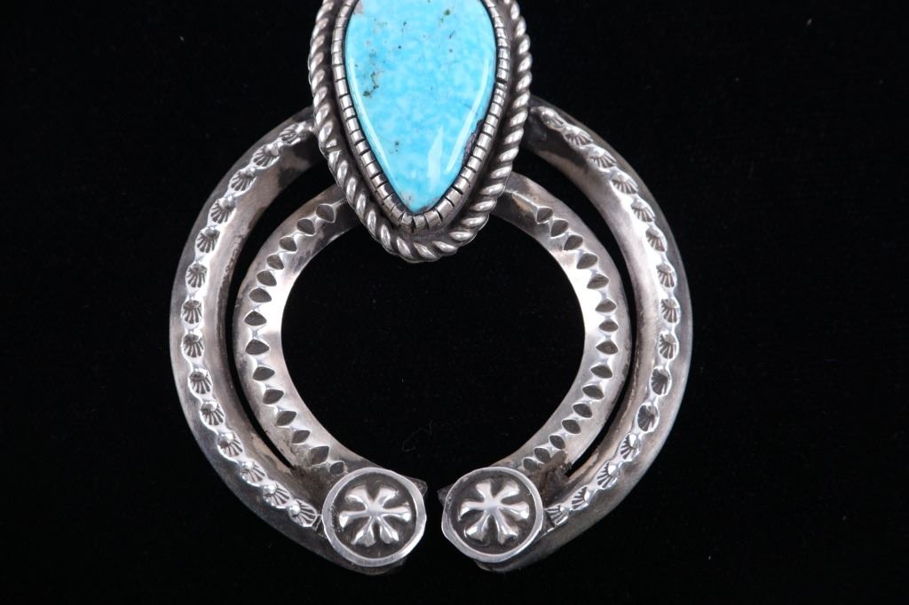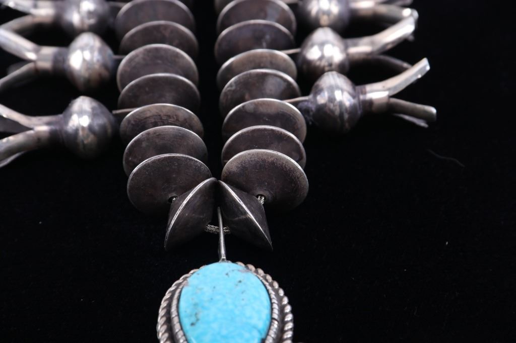 Featured in this lot is what is considered the finest completely hand-crafted example of squash blossom currently offered on the public market. The piece is from master silversmith Randy Begay Jr., son to renowned Randy Begay, and features a completely handmade large squash blossom necklace. Every element of this necklace is hand hammered and crafted from a blank piece of sterling silver by the artist, from the blossoms, beads, and pendant to the chain itself. The concho beads are large sterling silver examples hand pressed/hammered with a wonderful Old Pawn pattern of discoidal beads, totaling 46. The silver rope is hand braided and strung to a ring and link, handcrafted chain that ends in a handmade, adjustable, clasp and ring design. The necklace features ten total handcrafted blossoms adorning the necklace as spacers between the discoidal beads. The central pendant features a professionally and beautifully crafted Naga Squash with a double sterling silver bar construction, featuring hand hammered and tooled design set with a wonderful piece of natural turquoise from the Fox Mine (Fox Turquoise). The center stone is profusely decorated with a double, handcrafted, twisted rope border and a beautiful pear shape Fox turquoise cabochon. The Fox turquoise boasts a light and bright blue luster to the coloration and slight inclusions of mineral deposits that are small; the face of the stone is polished. The artist’s hallmark can be seen on the backside of the Naga pendant and features a 'sterling' stamp underneath the hallmark. The condition of this necklace is pristine and beautiful, with no obvious signs of damage. The measurements of this squash blossom from clasp to clasp are 26 1/2" and the Naga pendant measures 3 1/2" x 2 1/4" x 5/8". The collective weight of this necklace is 184.4 g. This is the best Squash Blossom necklace to come through this auction and is of the best quality available to the public market. Very few Randy Begay Jr. pieces of this size and magnitude are ever offered for sale, with this being one of his best pieces ever created. The necklace carried a gallery price of $20,000.