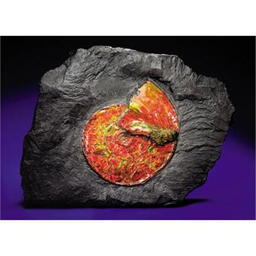 <B>OUTSTANDING OPALESCENT AMMONITE </B></I><BR> <I>Placenticeras meeki <BR>Cretaceous <BR>Bearpaw Formation, Southern Alberta, Canada </B></I><BR>A dazzling example of these highly sought-after specimens, this extremely bright, colorful ammonite displays broad flashes of fiery reds, greens and orange as well as some gold highlights. The ammonite itself measures 13 x 10 ¾ inches and is exposed on one side from the 27½ x 22 inch natural dark-gray shale matrix which provides the perfect background to highlight the dramatic aesthetic contrast of the fossil. The shimmering opalescent colors were naturally created through the combination of millions of years of compression and the mineralization of iron, copper and silica which precipitated from volcanic ash; the resulting gemstone is known as Ammolite, and can be found only in this locality in southern Alberta (the Blackpaw Indians know it as <I>aapoak</B></I> - "small crawling stone"). Unlike other gemstones, whose brilliance is caused by light reflected from the surface, the shimmering and ever-changing colors of ammolite are the result of light refracting through and rebounding from thin platelets of aragonite, the primary constituent of the ammonite's shell. <BR><BR><b>Shipping:</b> Requires 3rd Party Shipping (<a target="_blank" href="http://www.heritageauctions.com/common/shipping.php">view shipping information</a>)