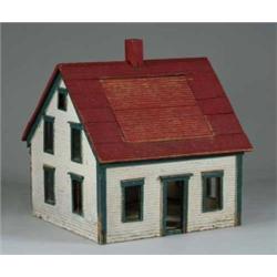 Lot # 556 OUTSTANDING PAINTED AND CARVED WOOD DOLLHOUSE. Carved slatted red roof has lift up panel for setting up. White carved clapboard siding with green windows. White interior surrounding shelf for set up and open first floor. There is a turn mechanism, which probably supported a curtain drop. PROVENANCE: Found in the Digby County, Yarmouth, Nova Scotia area. SIZE: 27” h x 26” l x 26” w. CONDITION: Generally very good. Two corner trim boards missing. 9-99762 (800-1,200)