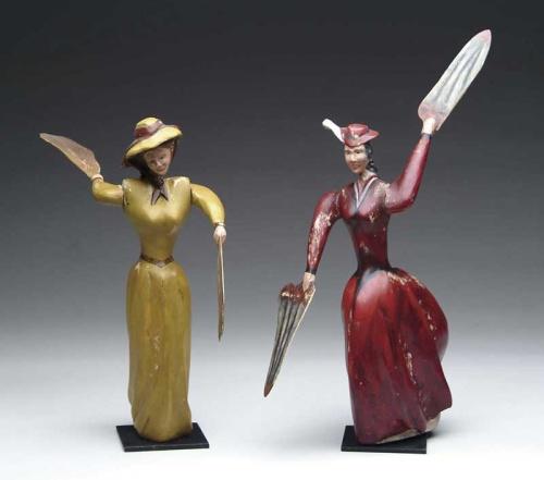 OUTSTANDING PAIR OF FOLK ART CARVED WOOD LADY WHIRLIGIGS. 1) Shows a lady in red dress with black trim. She wears a red hat with black stripe and white feather plume. Her up and down arms hold a painted parasol paddle. 2) Shows a lady in gold dress with gold hat having red ribbon. She has brown painted paddles. PROVENANCE: Carved by a WWII Veteran and found in Quebec “Iles de Orleans” Canada. SIZE: Wood paddles are 6” l. Whirligigs are 15” h. CONDITION: Generally very good, there is some wear to paint surface. 9-27524