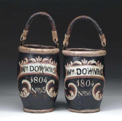 OUTSTANDING PAIR OF PAINTED LEATHER FIRE BUCKETS "WM. DOWNING 1804". One numbered "55" and the other is "56". The black bucket has a red, pink and white scrolled leaf decorative banner with black lettering "Wm Downing" which frames the date and number. Pink upper and bottom rings. Black painted leather handles have newer leather reinforcements at rings. These buckets were found in Kennebunk, Maine and comes with family history indicating that they were given by Ida Elwell who lived on Brown St. in the Carrie Emmons house circa 1930-40 by James A. MacDonald. It is believed that Mrs. Elwell's maiden name was Downing. SIZE: 12" h and 12-12/2" h to top of rims. CONDITION: Generally very good. Some repair to handles as indicated above. 9-27858