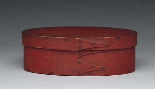OUTSTANDING RED PAINTED SHAKER OVAL BOX. Oval box has a one finger lid with two finger base. Copper tacks and pine bottom. SIZE: 2” h x 6-1/4” l x 4” d. CONDITION: Very good. 9-27395