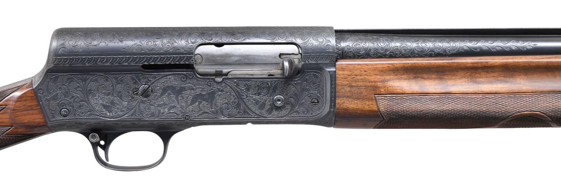 GRADE AUTO-LOADING SHOTGUN. Caliber: 20 gauge, 2 3/4". Serial Number: S6370. This impressive example typifies Remington's finest high grade firearms. The receiver presents full coverage vine type foliate scroll hand engraving with punch dot backgrounds as well as leafy borders surrounding the highly detailed scenes. The right side features upland scenes of two woodcock, two pointers and a covey of quail. The left side scenes show two ruffed grouse, two pointing setters and three woodcock. Complimentary engraving extends to the trigger guard and breech end of the 26" solid rib skeet choked barrel. The finger groove forearm and straight grip stock of fancy thin shell walnut feature segmented point-pattern checkering. The toeline of stock has a brass presentation plate with initial "W". Length of Pull: 14 1/4" over the original buttplate. Weight: 6 pounds, 15.8 ounces. CONDITION: action and barrel retain over 95% original blue, showing slight edge and carry wear. Stock and forearm exhibit a fine satin refinish, showing a few small handling marks. The checkering is freshened. Very good bright bore. (25-560/DS). CURIO. $3,500-5,000.