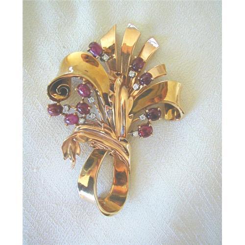 BURTON BROOK FARM ANTIQUES presents an outstanding classic Retro Period spray pin 3 1/4" long of 14K yellow gold and pink gold with 9 matched Burma rubies of excellent color & 9 diamonds corresponding to each ruby. Pin is 2 1/4" wide at widest point. This is a great vintage gem for any collector.