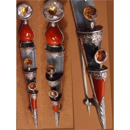 This is part of an antique collection of Scottish jewelry I bought at an estate from NY. ALL the pieces are early to MID 1800's. This is a sterling, layered and has some remarkable detailing and metal work. The dirk is in layers with genuine carnelian and agate and some very beautiful etchings. This also has an unusual clear and yellow top stone that I don?t know the name for. IT is truly a remarkable piece. This measures 2 ¾? long and very very old.