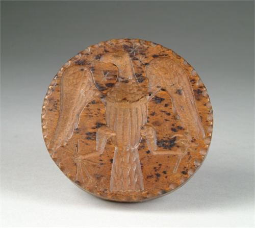 OUTSTANDING TWO PIECE DEEPLY CARVED WOOD EAGLE BUTTER PRINT. The spread winged eagle in nice detail holds arrows and olive branch. Four stars are seen around eagles head and notched outside border. Appears to be in walnut. SIZE: 3-3/4in. dia x 4-1/2in. with handle. CONDITION: Very good. 9-25362
