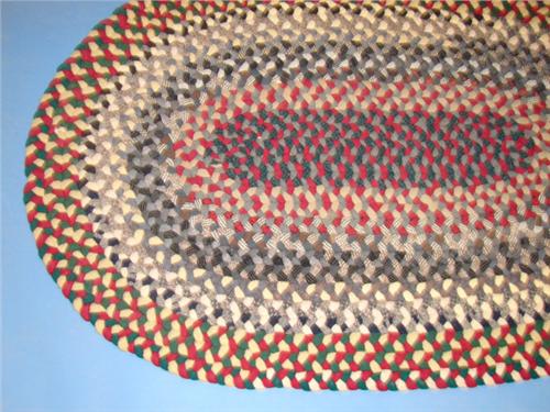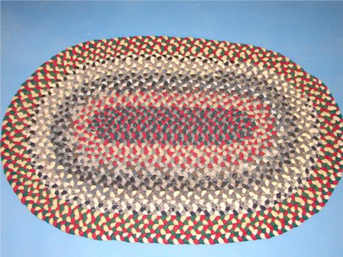 OVAL BRAIDED RUG. Decorated with green, red, gray, & blue colors. 47” x 31”