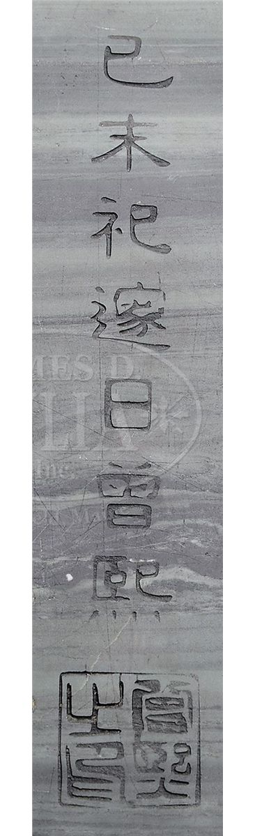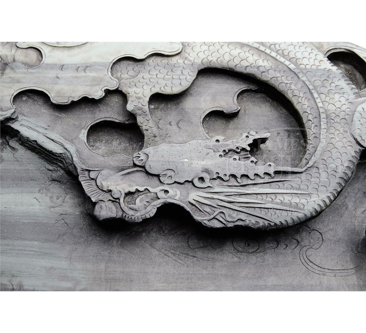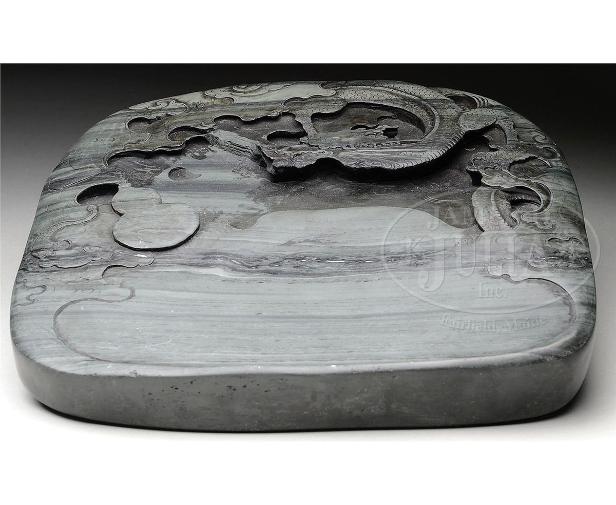 Early 20th century, China. Black striated grey green stone. Carving of a dragon emerging out of a double gourd. Inscription on the reverse. SIZE: 9" l w x 10" t. CONDITION: Very good. 7-74223