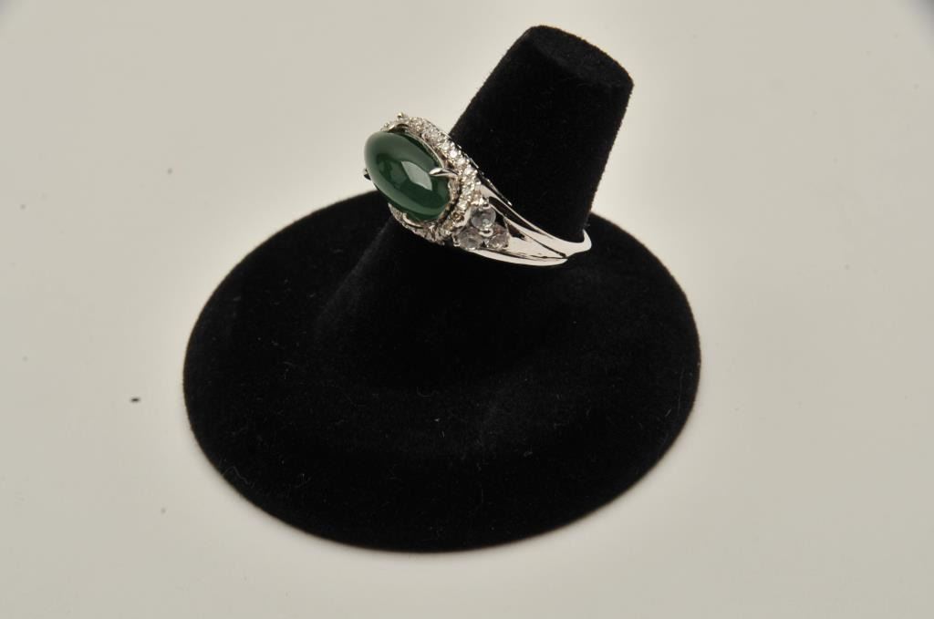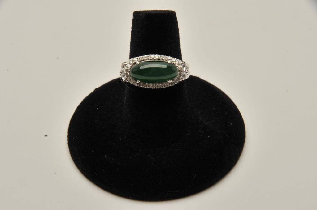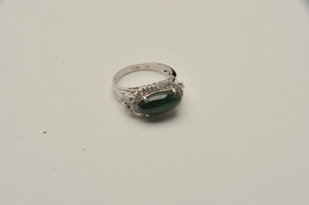 One beautifully designed oval jade ring in 18k white gold surrounded by 0.5 carats round diamonds Est:$1200-1500
