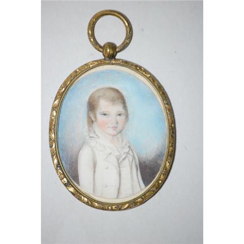 OVAL MINIATURE PAINTING ON IVORY - 19TH CENT. OVAL MINIATURE PAINTING ON IVORY OF YOUNG BOY IN WHITE OVERCOAT IN A GOLD PLATED FRAME W/ HAIR MEMORIAL ON BACK (NO HAIR)-UNSIGNED (ATTRIB. TO MRS. MOSES B. RUSSELL) - MINOR WEAR