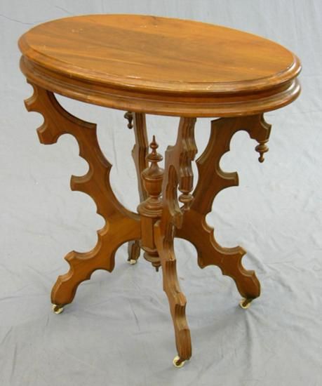 OVAL OCCASIONAL TABLE ; American Victorian Carved Walnut Oval Lamp Table, c. 1870, the stepped edge top with a stepped skirt, on four cabriole legs around a central turned finial, H,- 28 1/2 in., W.- 28 1/2 in., D.- 19 in. MWF647