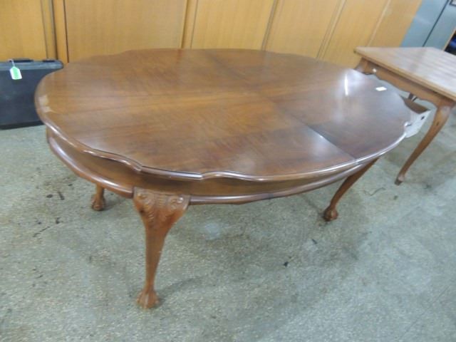 QUEEN ANN STYLE LEGS WITH BALL AND CLAW FEET. 67" X 42" WITH A SINGLE SELF STORING LEAF UNDER THE TOP THAT ADDS 20" TO THE TABLE GOOD CONDITION. AS SHOWN.