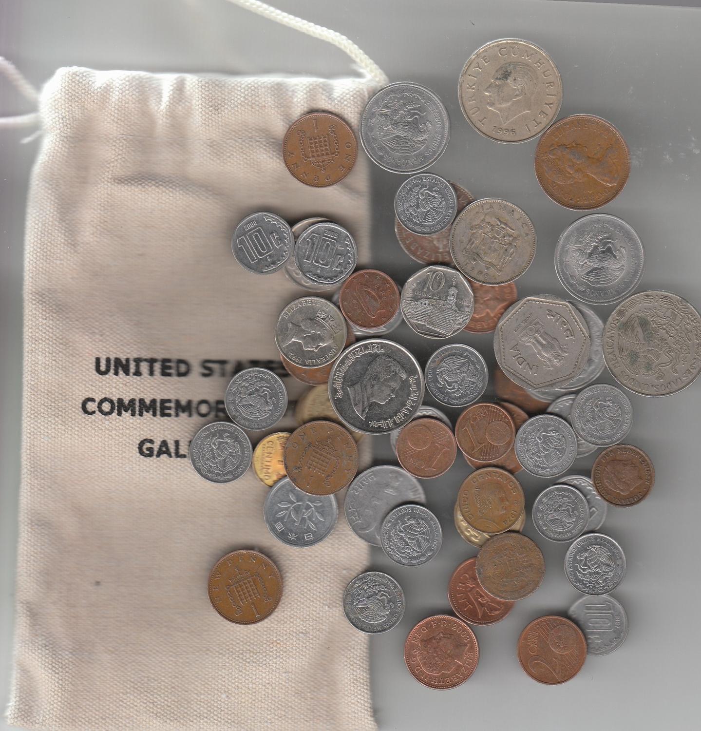 OVER 50 COINS IN CANVAS BAG FOREIGN