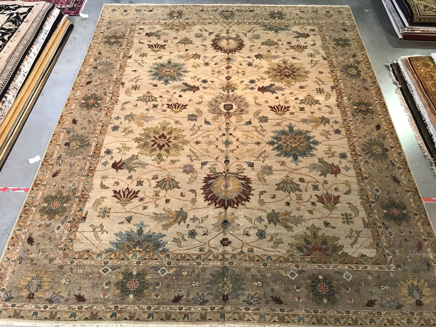 12x15 Fine Oversize Hand woven Antique reproduction Persian Mahal design rug 100% natural vege dye wool pile, Tan, and multi accent colors, hand knotted in india