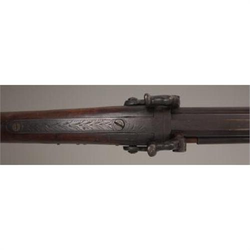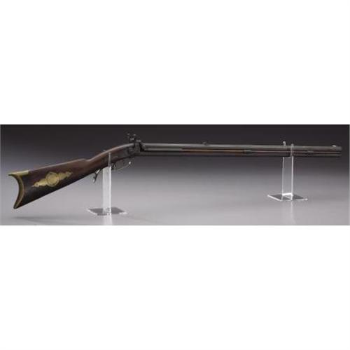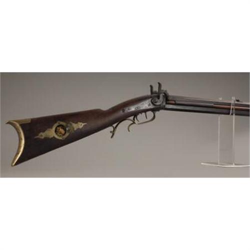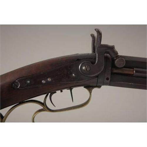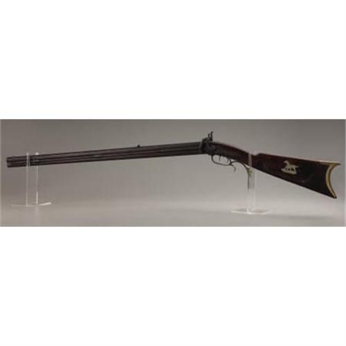 <B>OVER & UNDER PERCUSSION RIFLE BY J. HARDER, LOCK HAVEN, PA.</B></I> Circa 1860-1880. 38" octagon barrels of approximately .45 caliber. Maker's name stamped on lower barrel with ornate Moore marked back action lock plate on right side of rifle. Ornately engraved top tang. Brass patch box, trigger guard, butt plate. Raised cheek piece with large silver dog inlay. Functioning set triggers. Both ramrods intact. <BR><BR><B>Condition:</B></I> Good sound wood with minimal handling Mars. Metal surfaces are very respectable with minor pitting only appearing at barrel breaches. This is a very nice example of a relatively hard to find over & under percussion rifle.<BR><BR><b>Shipping:</b> Bats, Clubs, Sticks, Swords, Rif (<a target="_blank" href="http://www.heritageauctions.com/common/shipping.php">view shipping information</a>)