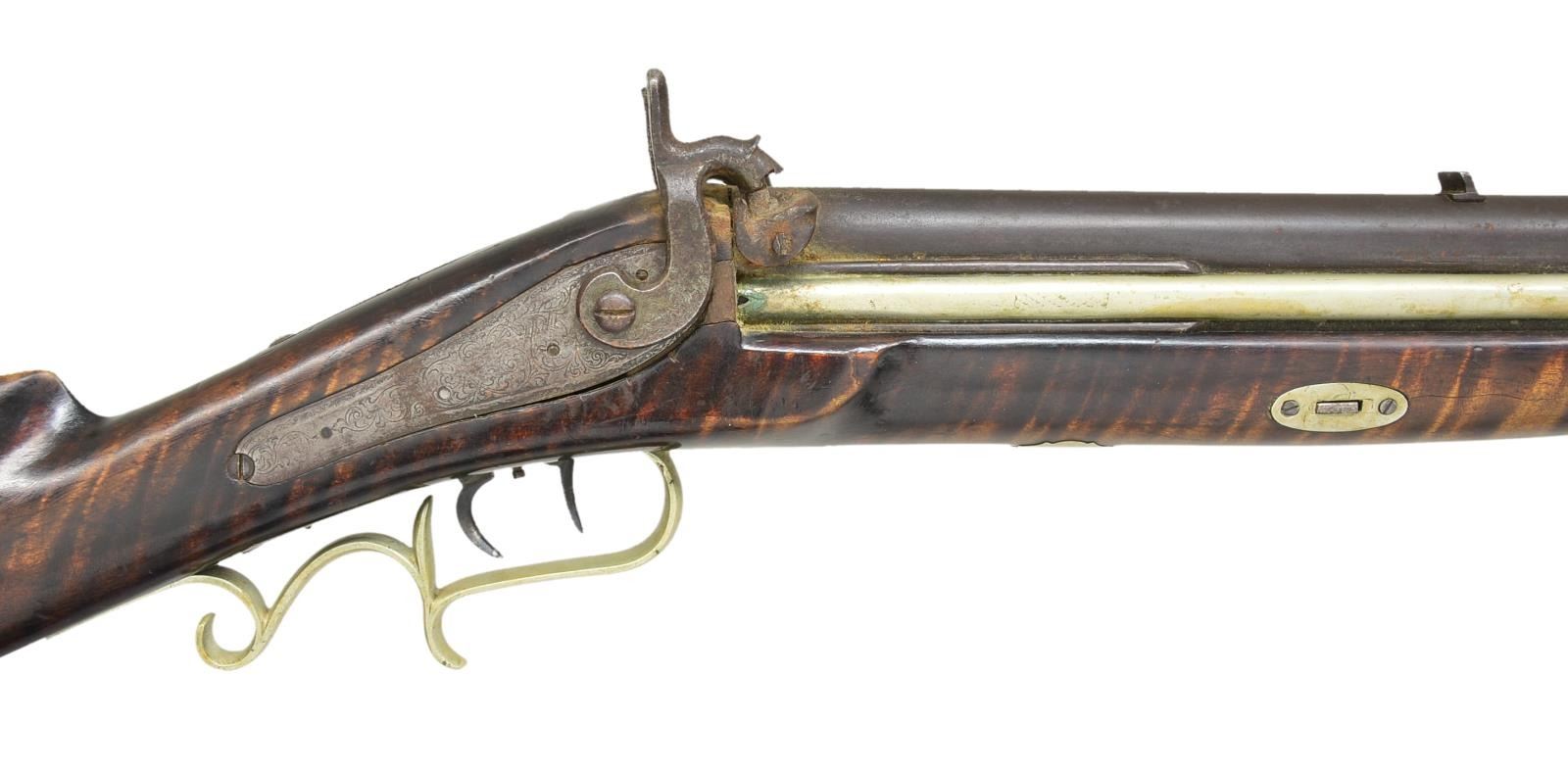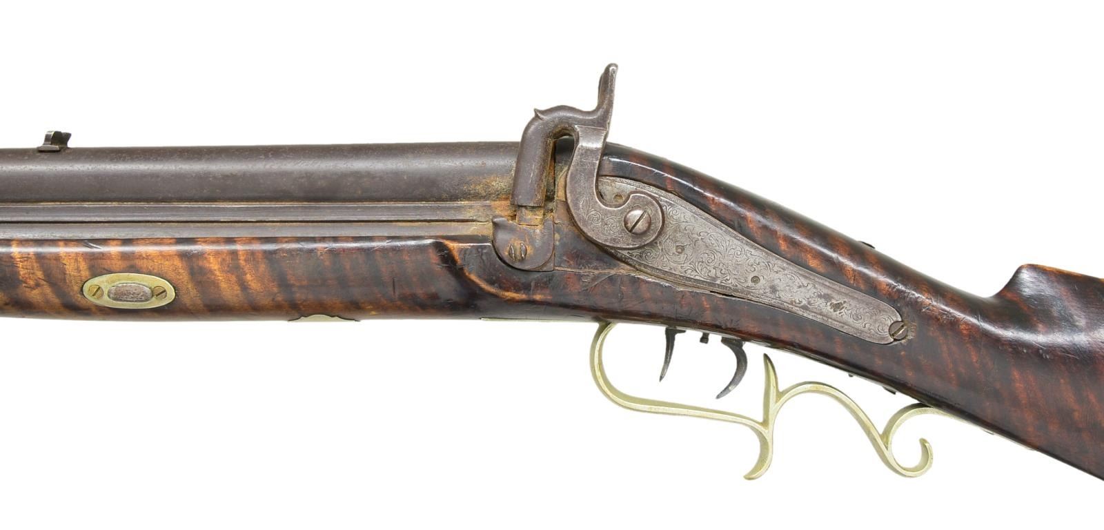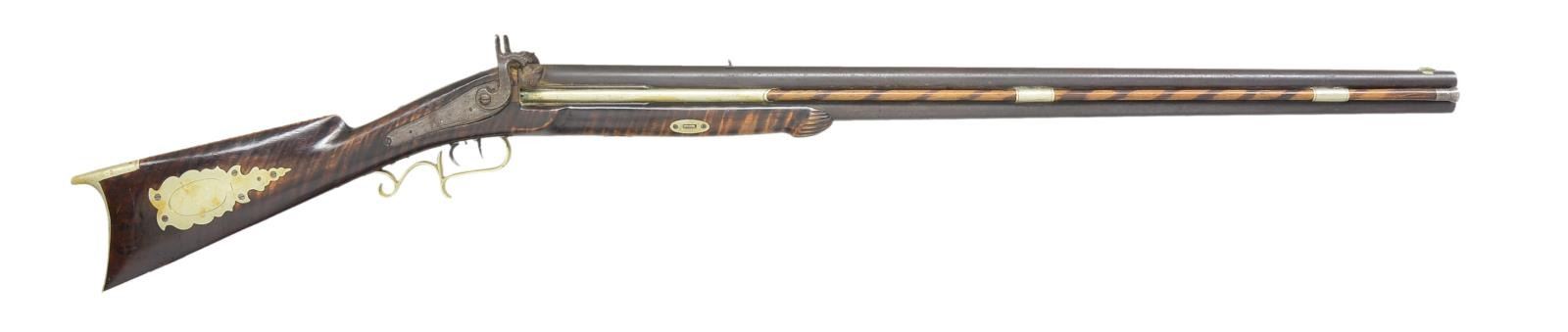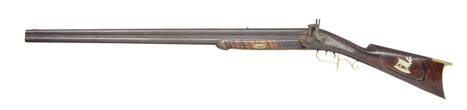 BY P. KOCKLER. Cal. 45 rifled over 68 smoothbore. NSN. Overall length 48". Bbls. 31 3/4" rnd. This is a very late percussion O/U gun w/ back action locks. Gun is completely silver mounted. The buttplate inlays, ramrod ferrules & trigger guard are all silver, as opposed to the typical brass. The stock is curly maple w/ a silver cap box. Cheekpiece has silver elk inlay. The gun was made by P. Kockler (Cockler) (1870-1880), Lewisburg, PA, so stamped on bbl. Kockler learned his trade from F. Beerstecher. CONDITION: clean & original throughout. PROVENANCE: Collection of Dr. John Persing. (01-19562/RG). ANTIQUE. $1,000-1,500.
