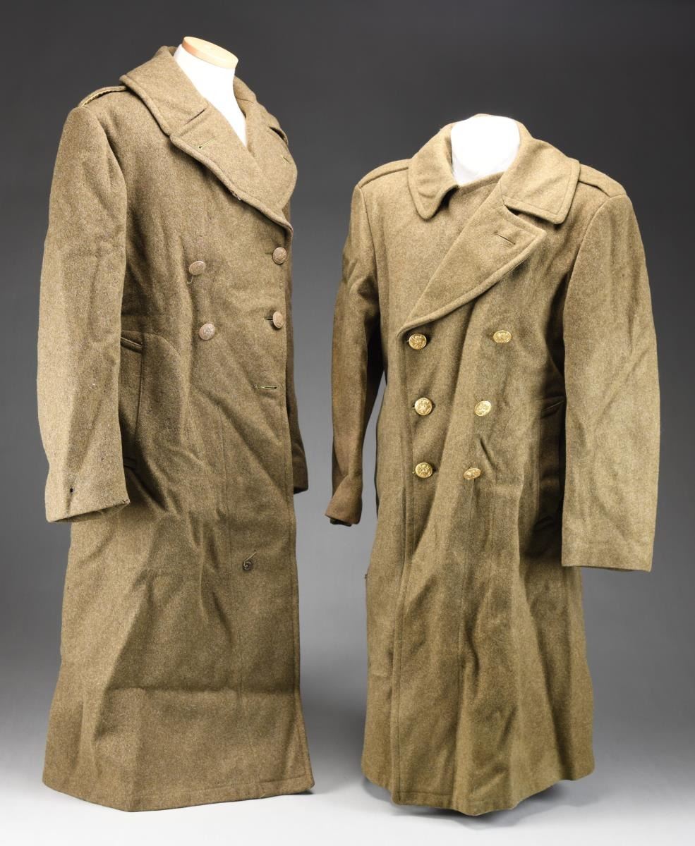 2 WWII US Army enlisted man's overcoats in heavy field green wool. One example is size 38 short and has gilded metal buttons. The other is size 40 long and has dull green composite buttons. CONDITION: both overcoats are in solid condition with only traces of moth tracks. (02-19497-2/BF). $100-200.