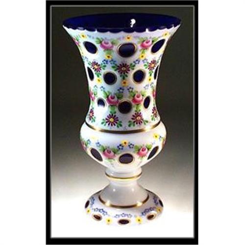 Gorgeous Bohemian white cut to cobalt glass overlay vase hand enameled with floral decor. Excellent condition, dimension 9" high, Czechoslovakia circa 1950. Photo sizes are automatically reduced for Ebay Live Auctions. If you want to see larger, more detailed pictures, please email us