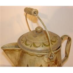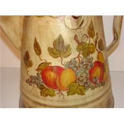 OVERPAINTED TOLEWARE COFFEE KETTLE. Overpainted with fruit decoration. 15" H to top of handle.