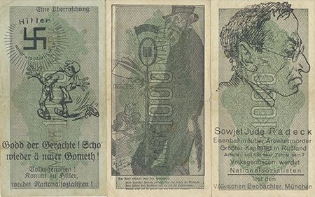 Lot of four obsolete 1,000 Reichsmark Series 1922 banknotes overprinted on the verso with anti-Semitic messages meant to blame Jews for Germany's poor financial condition. Texts are all different, reading in part: "The gold, the silver and the bacon the Jew took from us and left us this shit. How long do you want to be betrayed and plundered by the Gold International? Come to Hitler and join the National Socialists...God the righteous! A new one has come again! [Hitler]...Soviet Jew Radek Train and workers' robber...Do you want him for your fuhrer?...Become National Socialists...You can recognize the prophets from their beards...". Caricatures show a Jew taken aback by a shining swastika, a British Jew making a radio address, etc. Very good.