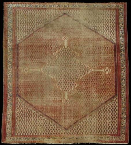 OVERSIZE ORIENTAL CARPET. All over design with a large central geometric medallion. Colors of blue, red and ivory. SIZE: 11’7” x approximately 17’6”. CONDITION: Extremely worn, being sold as is. 9-27017