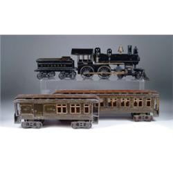 OVERSIZED PRATT & LETCHWORTH PASSENGER TRAIN. Believed to be the largest cast iron toy train ever made, one wonders how a child could have ever have played with such an elephantine toy! Truly a phenomenal casting effort, considering that the passenger car alone is 20" long! A finely detailed train, especially the passenger cars that have incredible pinstriping and are stenciled, "NEWYORK CENTRAL AND HUDSON RIVER R.R., VANDERBILT". The combination baggage/passenger car is also rubberstamped "NEW YORK CENTRAL AND HUDSON RIVER R.R., WAGNER BUFFET VESTIBULE". The engine is stenciled "999" and the coal tender is rubberstamped "N.Y.C. & H.R.R.R." and "999" on rear. SIZE: 60" l (overall). CONDITION: Overall very good. JL 1-4009 (700-900)