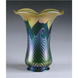 Lot 207 OVERSIZED QUEZAL SHADE R#257. Gold hooked feather decoration on a green ground (outrageous blue-purple iridescent finish) with double hook gold stretched ruffles. Very rare shade. Ex-collection Darrah Roberts. Signed “Quezal”. SIZE: 3” fitter x 8” t x 7” w. CONDITION: Very good with roughness to stretched rim, possibly in the making. 5-70453