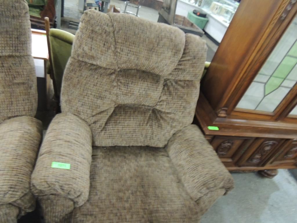 OVERSTUFFED RECLINER CHAIR, LAZY BOY STYLE CHAIR, UPHOLSTERED CHAIR, COMFY, CLEAN, BROWN FABRIC CHAIR, AS SHOWN SEE PHOTO FOR MORE DETAILS.