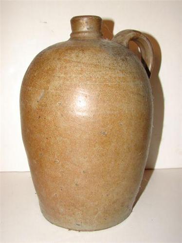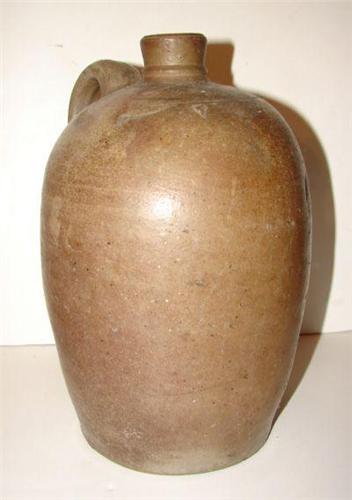 OVOID STONEWARE JUG. 1 gallon. Incised line decoration at top of body. Stamped “1” near top of handle. Shows one tight circular hairline crack on body. 11” H