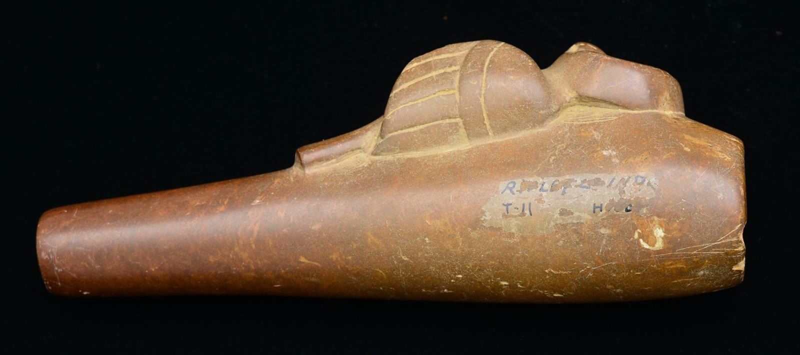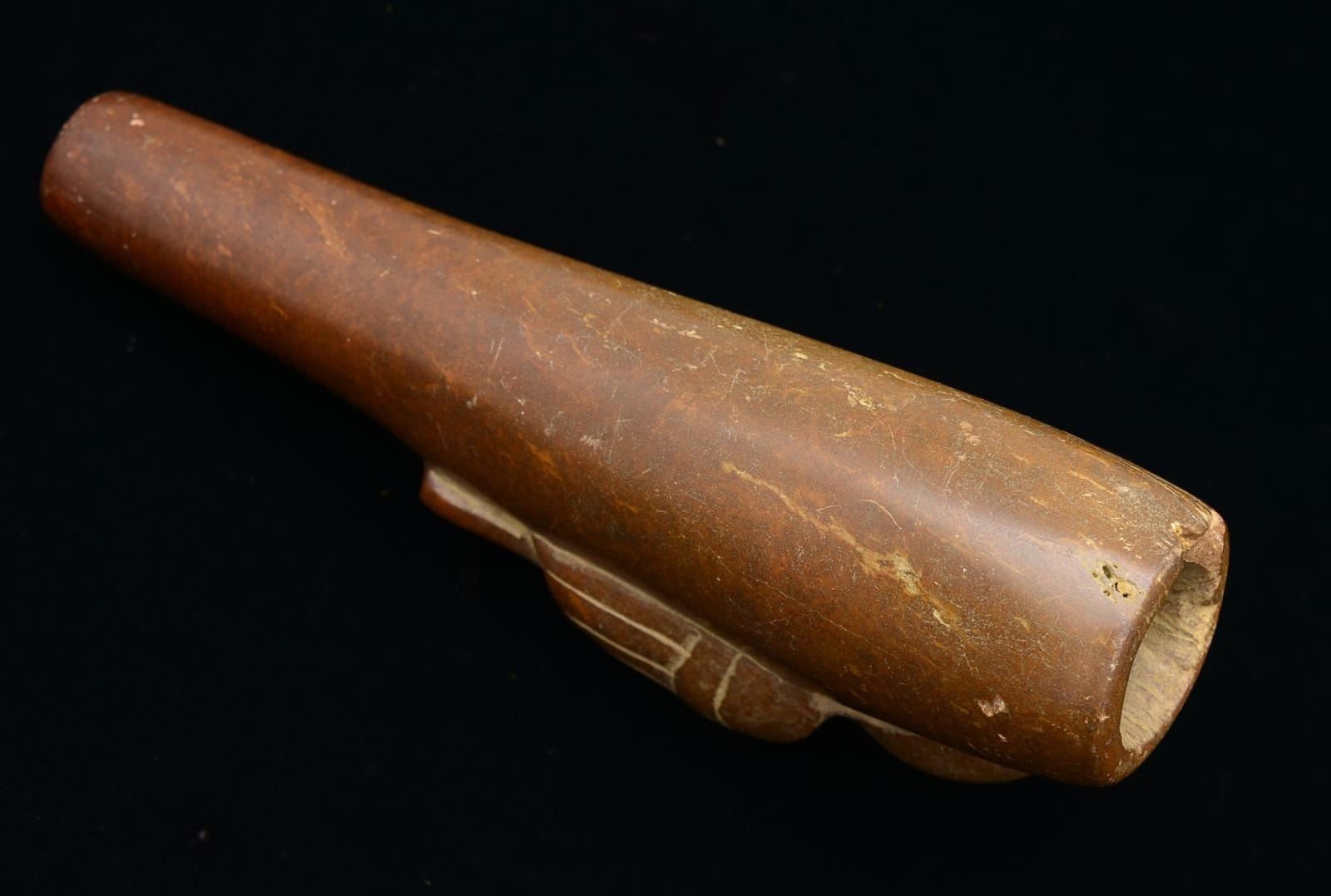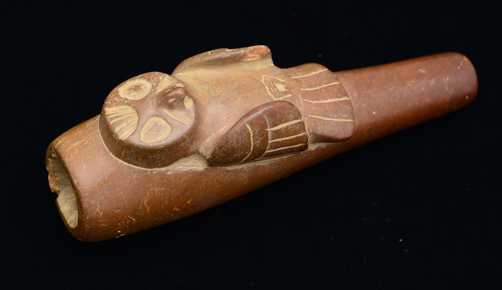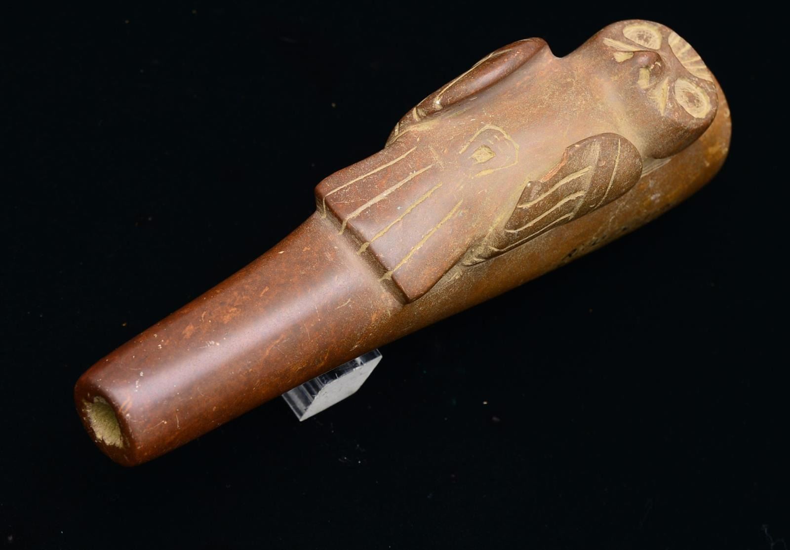 A Native American carved stone pipe possibly found in Indiana, depicting an owl lying on its back on top of the pipe. The exact age of this pipe is difficult to determine but it does have what appears to be collection identification on the right side. The partially legible ink inscription reads, “RIPLEY CT IND T-II H_ _”. CONDITION: pipe shows age & some use. The front of the pipe has several sm. chips as does the opening at the rear of the pipe. (02-14021/BF). $700-1,400.