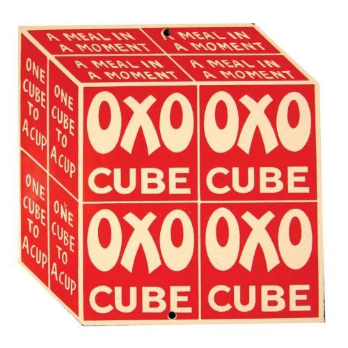 OXO Cube Bullion die cut porcelain sign. Mint condition. 8 1/4 X 9 1/4 inches.