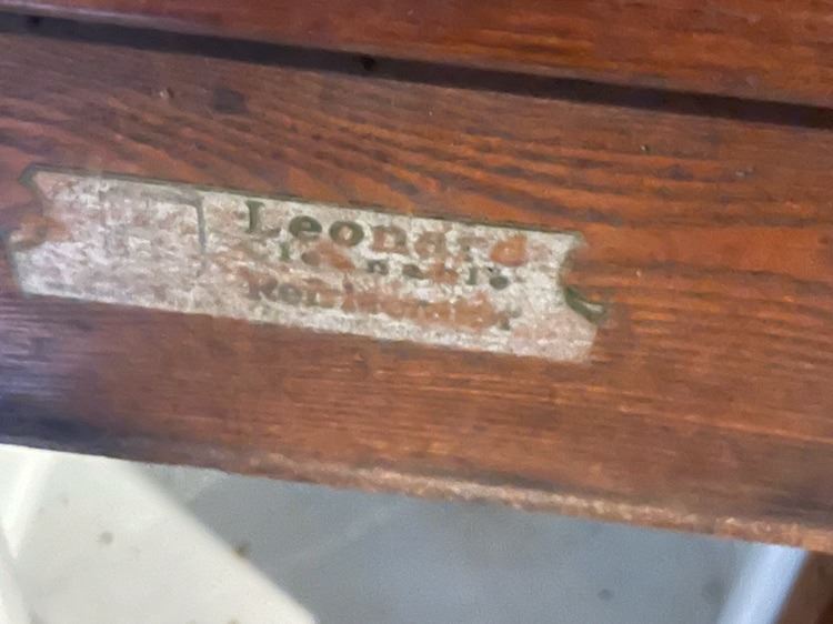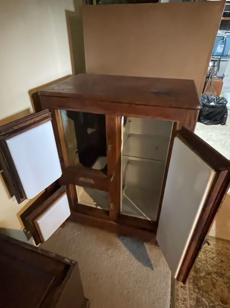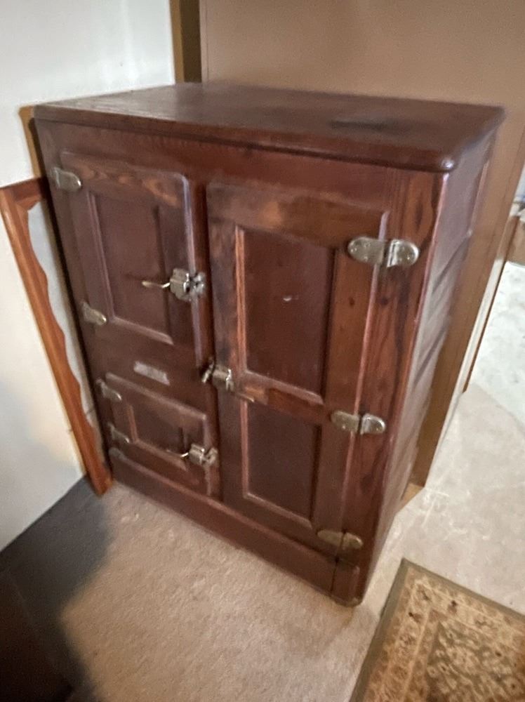 Oak 3 Door ice box, lenard, wth porcelain interior, beautiful original finish. Would make a wonderful bar.