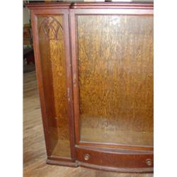 Oak 3 door bookcase with drawer. Has one large center door in middle with glass, and two small glass end doors. Measures 60 1/2" tall, 58" wide, and 13 3/4" deep.