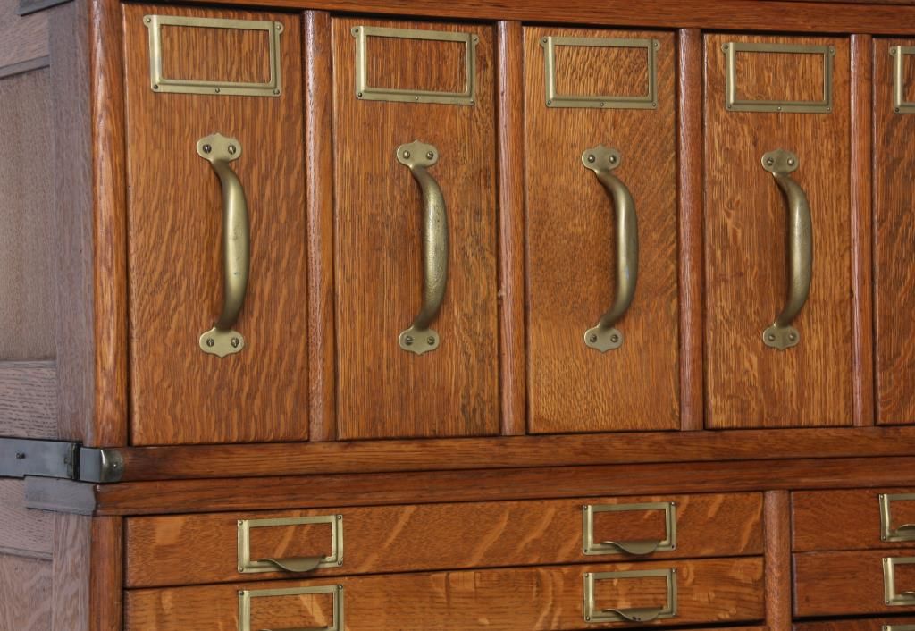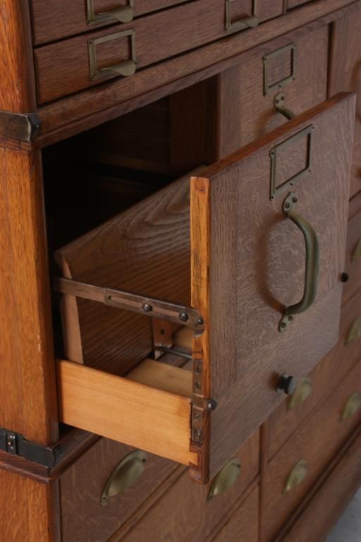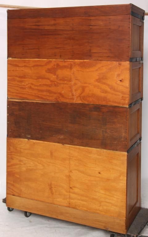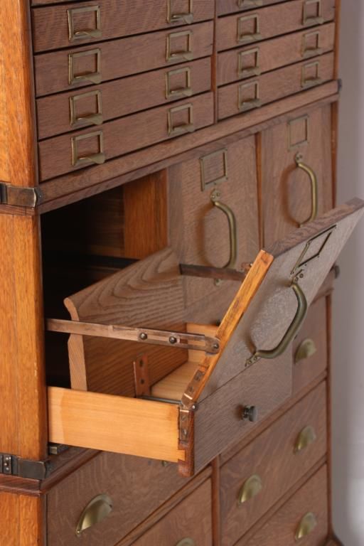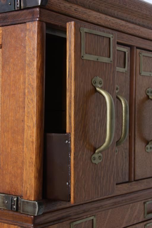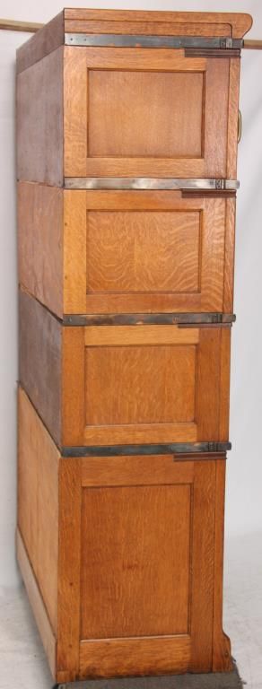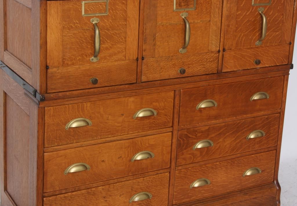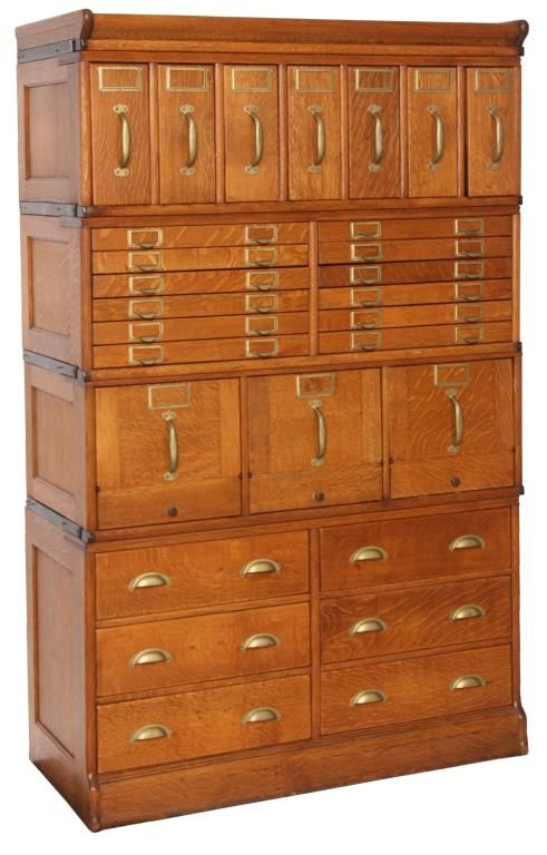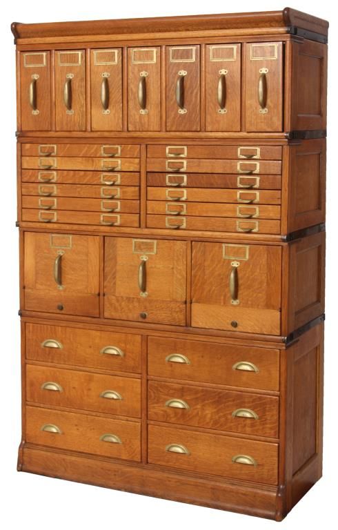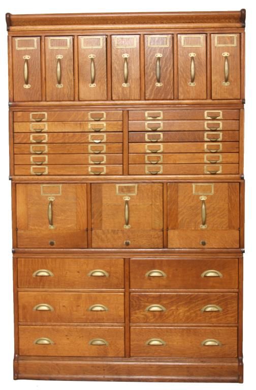 Oak 4 Section Stacking File Cabinet. 7 vertical standing drawer section, 12 drawer horizontal filing section in 2 rows, 3 large drawer file section and 6 drawer bottom section in 2 rows; each section has pulls with a gilt painted finish and identification plaques on the front of the file drawer. In very good condition. 66 in. high x 41.5 in. wide x 18 in. deep.