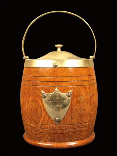 Oak Biscuit Jar with nickel shield, bale and lid. Crack in bowl otherwise good original condition. 6 inches tall.