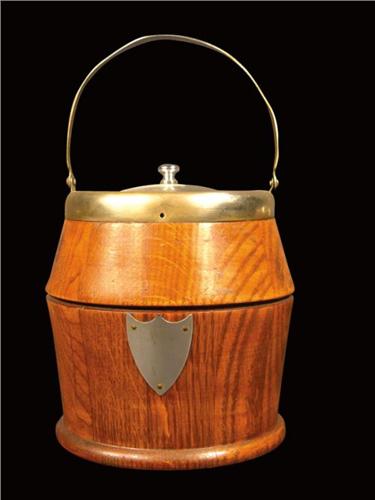Oak Biscuit Jar with nickel shield, bale and lid. Excellent original condition. 6 inches tall.