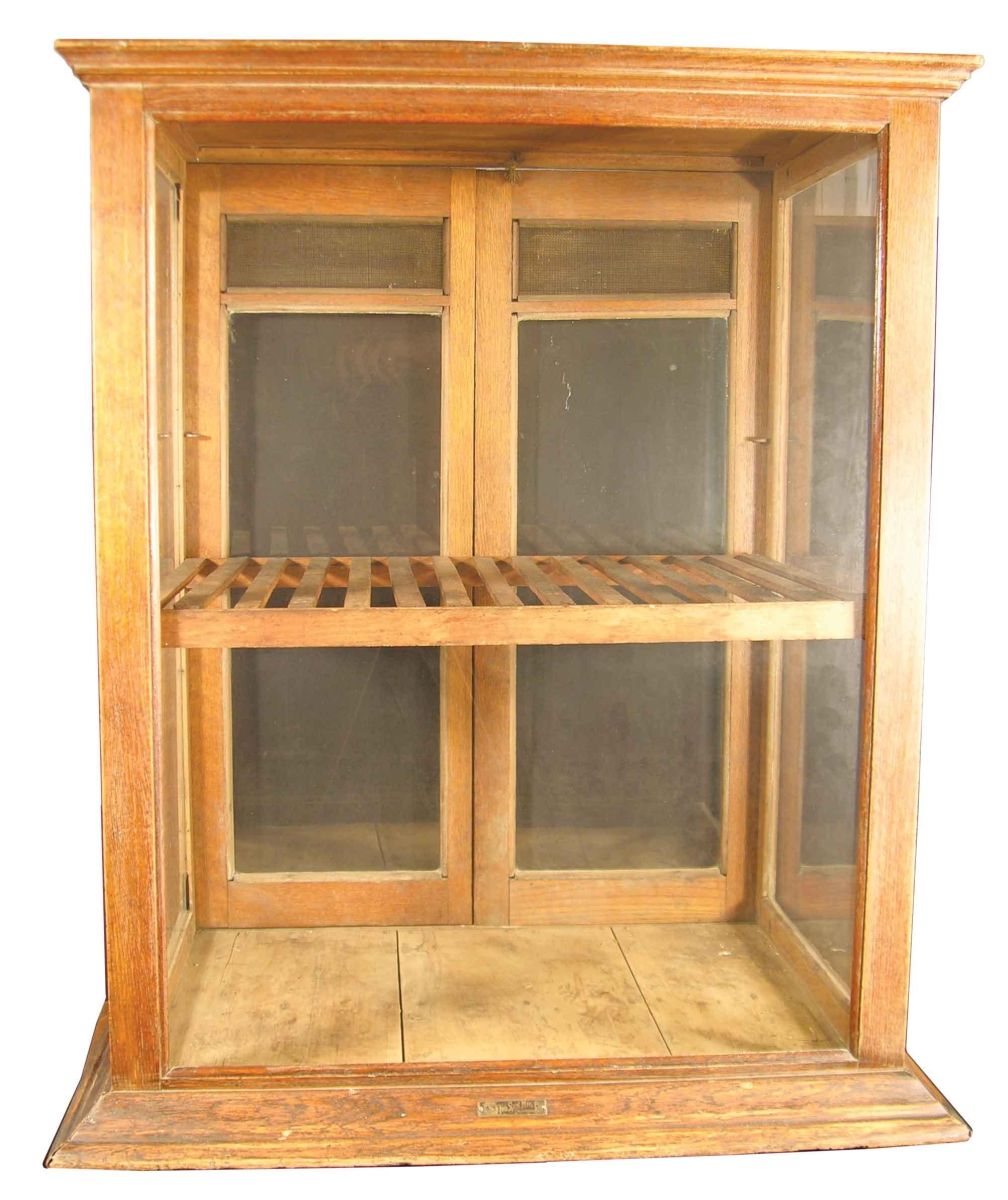 Oak Bread Display Cabinet w/ wood table base. The Sun Mfg. Co., Columbus, OH. Good original condition. 31 X 36 X 24 inches cabinet only.