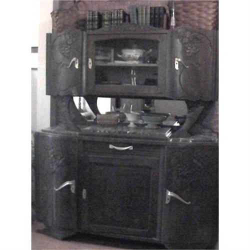 A gorgeous oak veneer 1940s French buffet with a brown marble top in perfect condition with original beveled mirror. Boasts original finish and hardware. No shipping, will need to arrange for pick up. Will deliver within a 2 hour radius of Washington MO for 50 cents per mile.