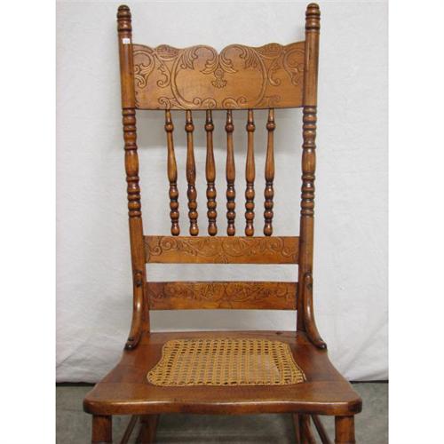 Oak Carved Spindle Cane-seat Rocking Chair, This rocker features scroll incised back over six spindles, cane seat, double stretchers, 29"H x 18"W seat. Condition: no damage noted.