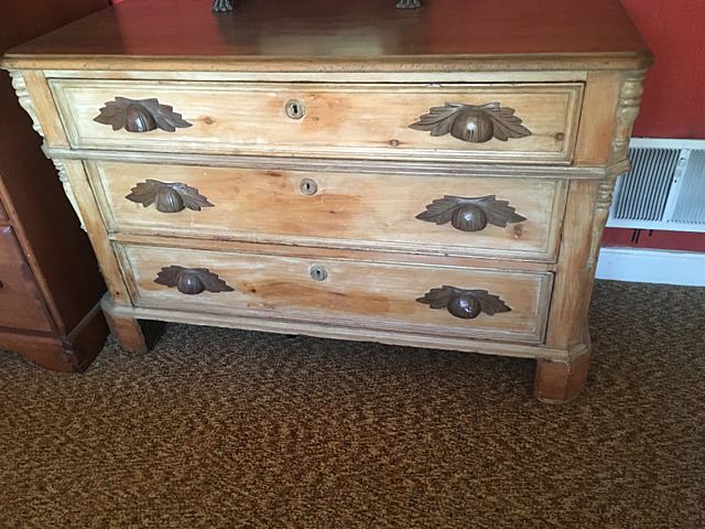 Vintage oak chest with acorn carved pulls, column sides, from the farm.