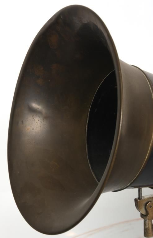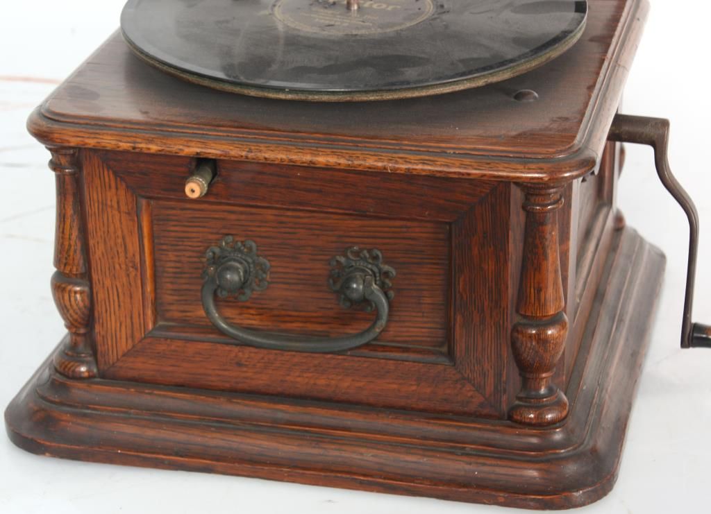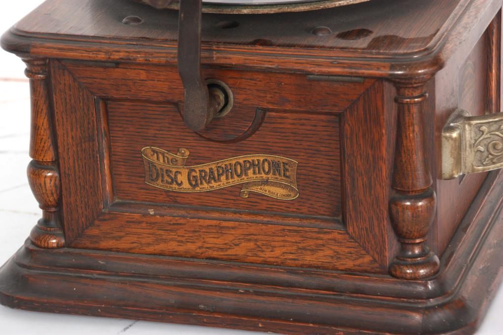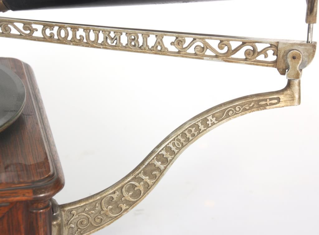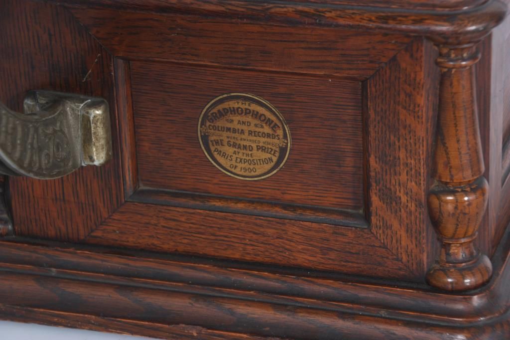 Oak Columbia Model AH Disc Graphophone. Oak case with turned corner columns, inset panels on the sides, “The Disc Graphophone” banner logo on the right side and decal on the rear reads “The Graphophone and Columbia Records, Grand Prize at the Paris Exposition of 1900”. Horn has a rare style support arm with “Columbia” and filigree in relief, and long pierced tone arm with “Columbia” and filigree; 10 in. spring driven turn table and black painted conical horn with brass trumpeted bell. Stamped on the base plate with model AH and serial number 3502. Overall dimensions 21 in. high x 13 in. wide x 28 in. deep