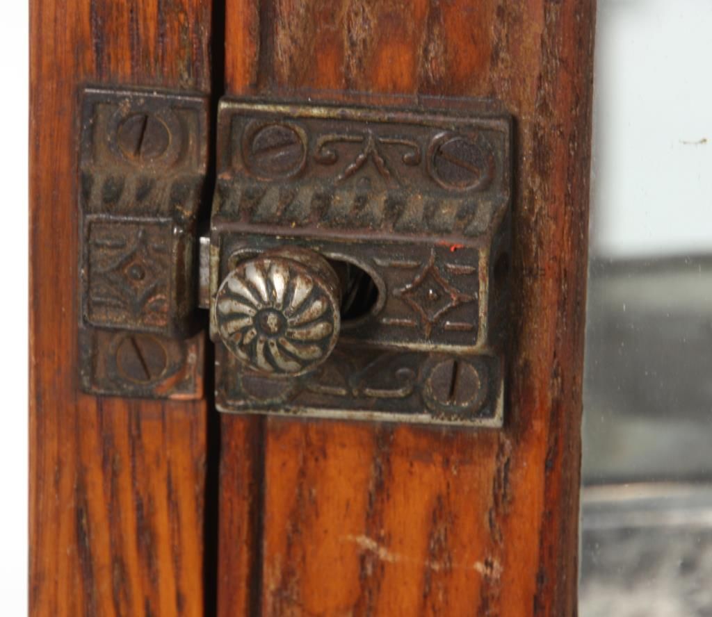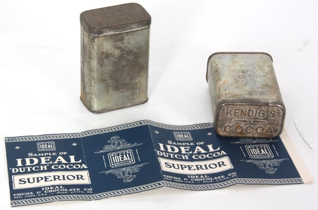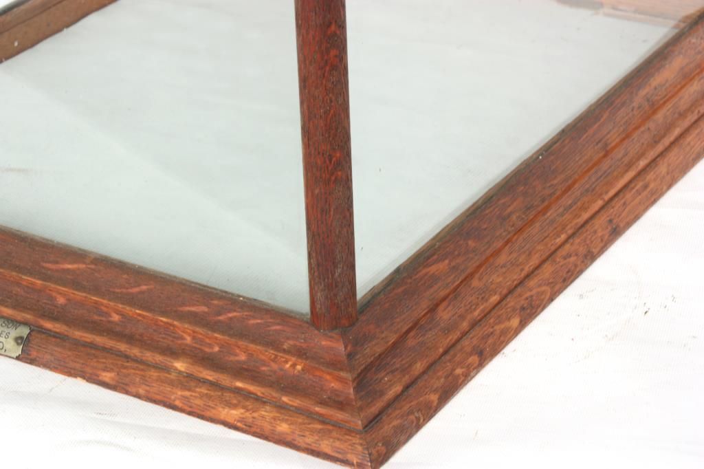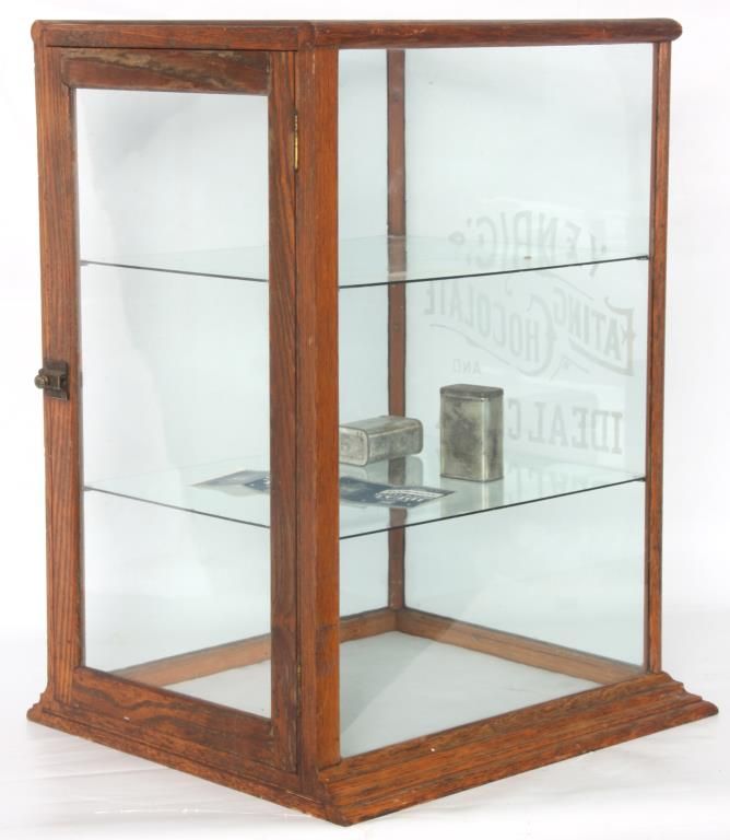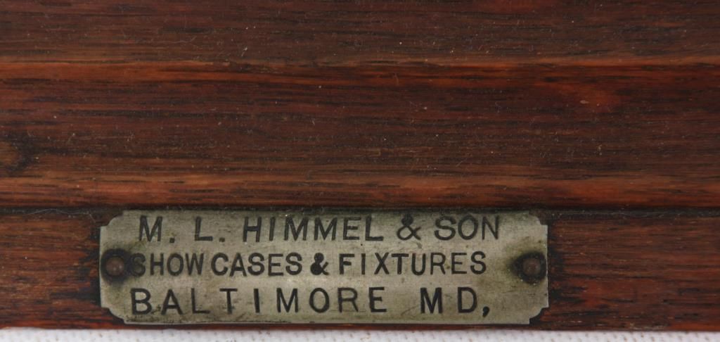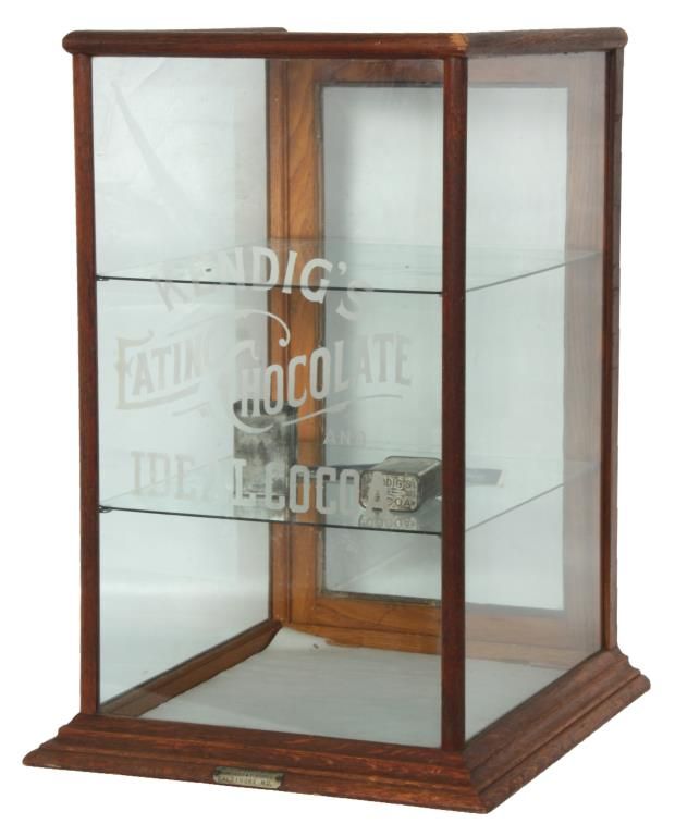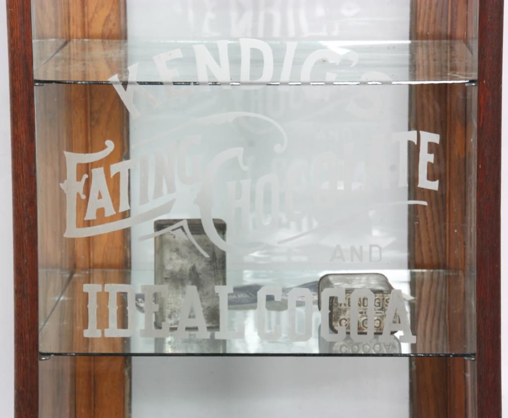 Oak Countertop Store Display Cabinet. Oak case has a splayed base with wood trim around the glass front, top and side panels and wood framed door in the rear; the front of the case has acid etched lettering for “Kendig’s Eating Chocolate and Ideal Cocoa”, 2 glass shelves, 2 Kendig’s Cocoa tins and signed by the maker on a nickel label on the front “M.L. Himmel & Son, Showcases & Fixtures, Baltimore, MD”. 28 in. high x 19 in. wide x 21 in. deep.