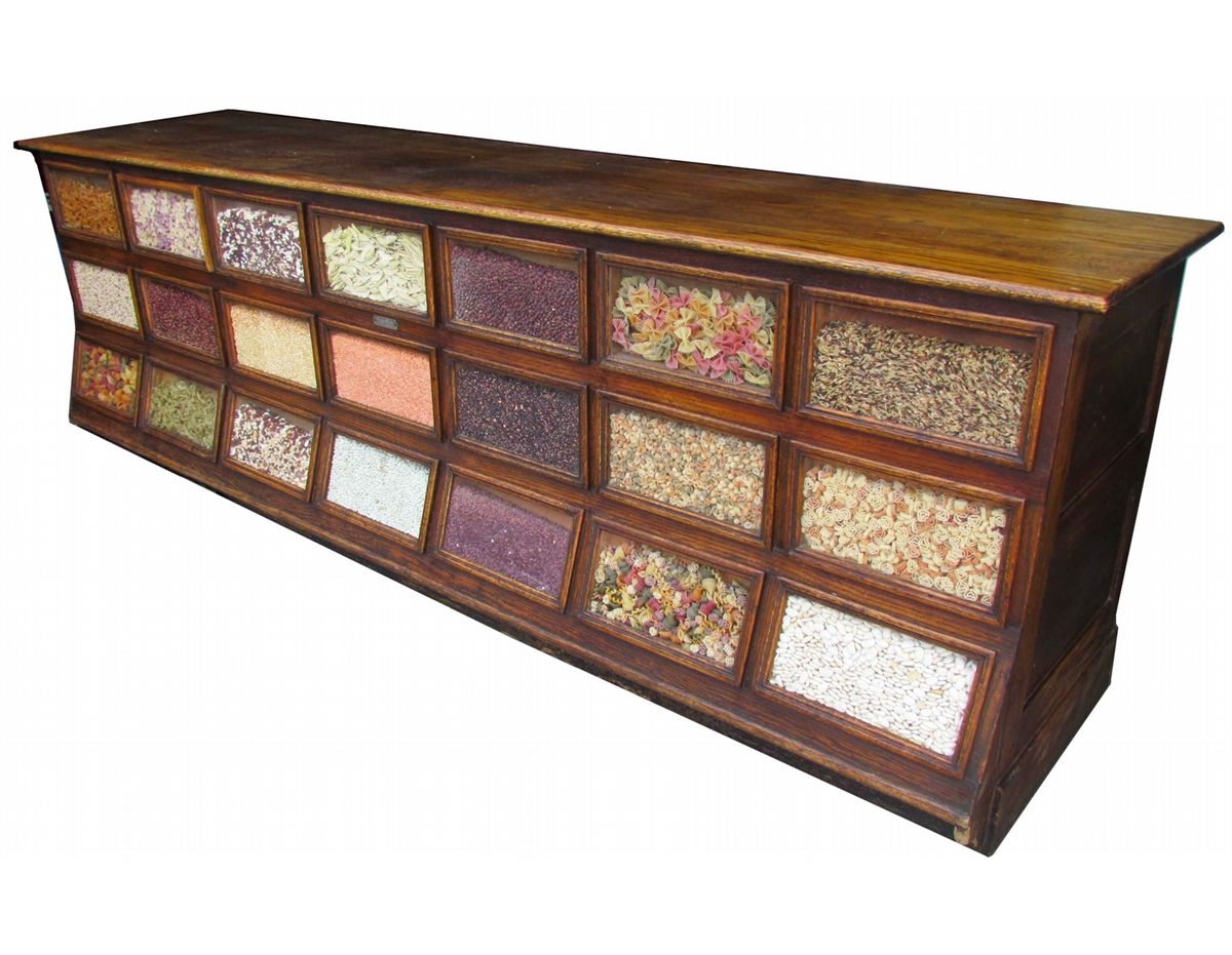 Oak Country Store Bean Counter. 21 Glass front display windows. Two drawers missing in back otherwise excellent all original condition. 104 X 34 X 26 inches.