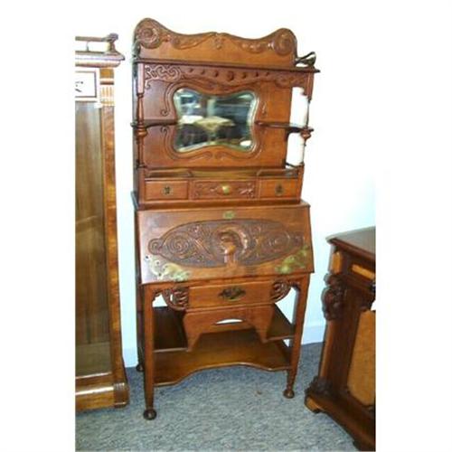 A rather rare transitional style carved oak Cowboy Desk in all original condition with beveled mirror.